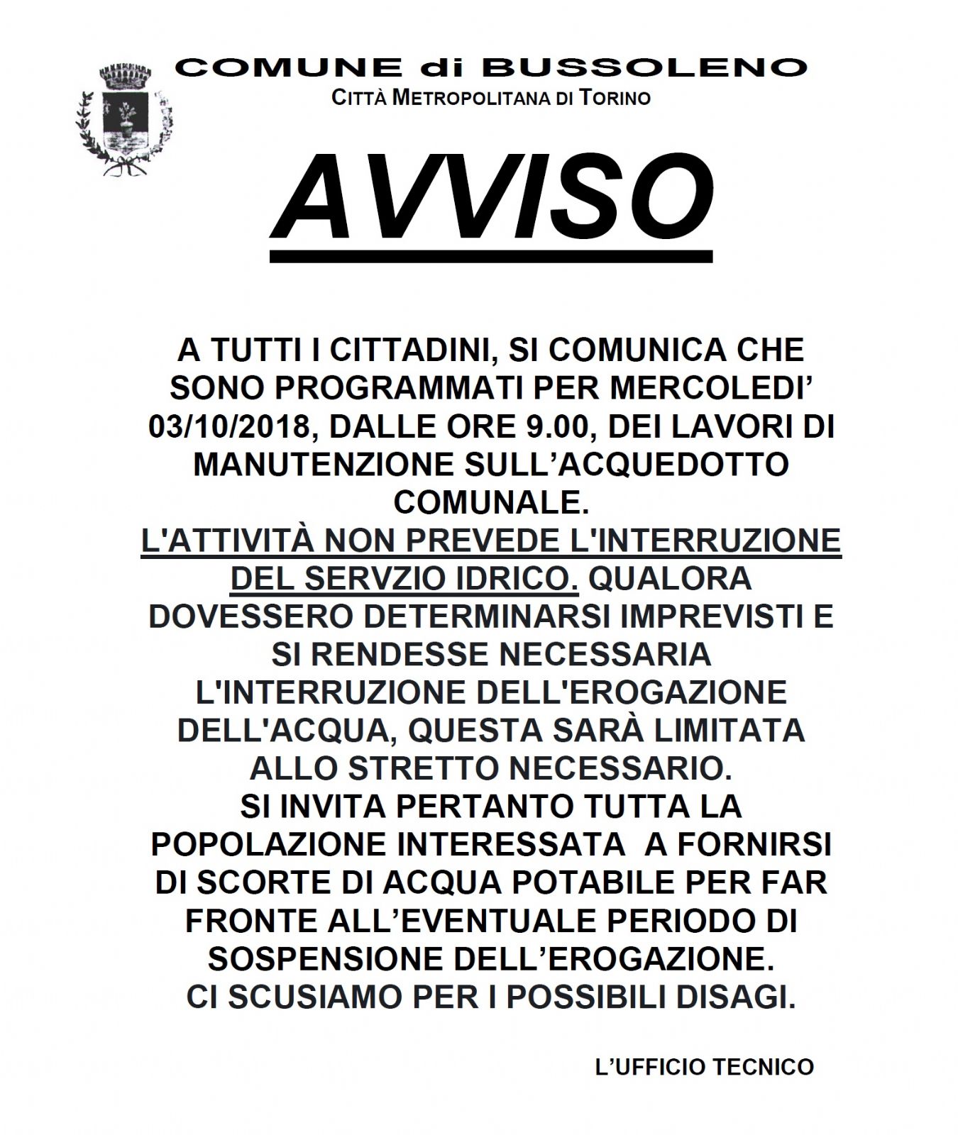 A TUTTI I CITTADINI, SI COMUNICA CHE SONO PROGRAMMATI PER MERCOLEDI’ 03/10/2018, DALLE ORE 9.00, DEI LAVORI DI MANUTENZIONE SULL’ACQUEDOTTO COMUNALE.