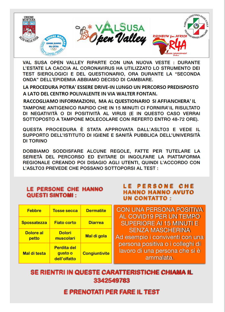 Il Progetto Valsusa Open Valley ritorna a Bussoleno. Dopo l'esperienza positiva dell'estate per venire incontro alle richieste della popolazione e per ottenere un tracciamento della diffusione del virus in Valle, riparte il progetto in questa fase di recrudescenza dell'infezione. Ora, chi riscontra dei sintomi assimilabili al covid-19 o è stato in contatto stretto con persone risultate positive, può prenotarsi ed effettuare il test antigenico rapido e, in caso di positività, l'immediato test molecolare con esito entro 48/72 ore, al costo di 40 euro. Il Sindaco ringrazia il team dell'Alta Valle che insieme alla Pubblica Assistenza e a Raimbow for Africa hanno organizzato questa iniziativa con l'avvallo dell'ASLTO3 per quanto riguarda il tracciamento istituzionale e la Croce Rossa di Bussoleno per la compartecipazione e per il supporto logisitco. Si inizia mercoledì 22/11 per un appuntamento che può ripetersi settimanalmente.