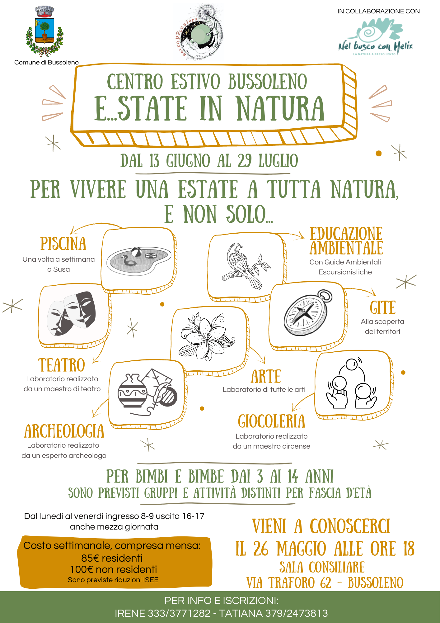 Il Comune di Bussoleno organizza, come ogni anno, il centro estivo per bambini da 3 a 14 anni, dal 13.06.2022 al 29.07.2022, orario 8.00-17.00 oppure mezza giornata 8.00-12.00 o 13.00-17.00.