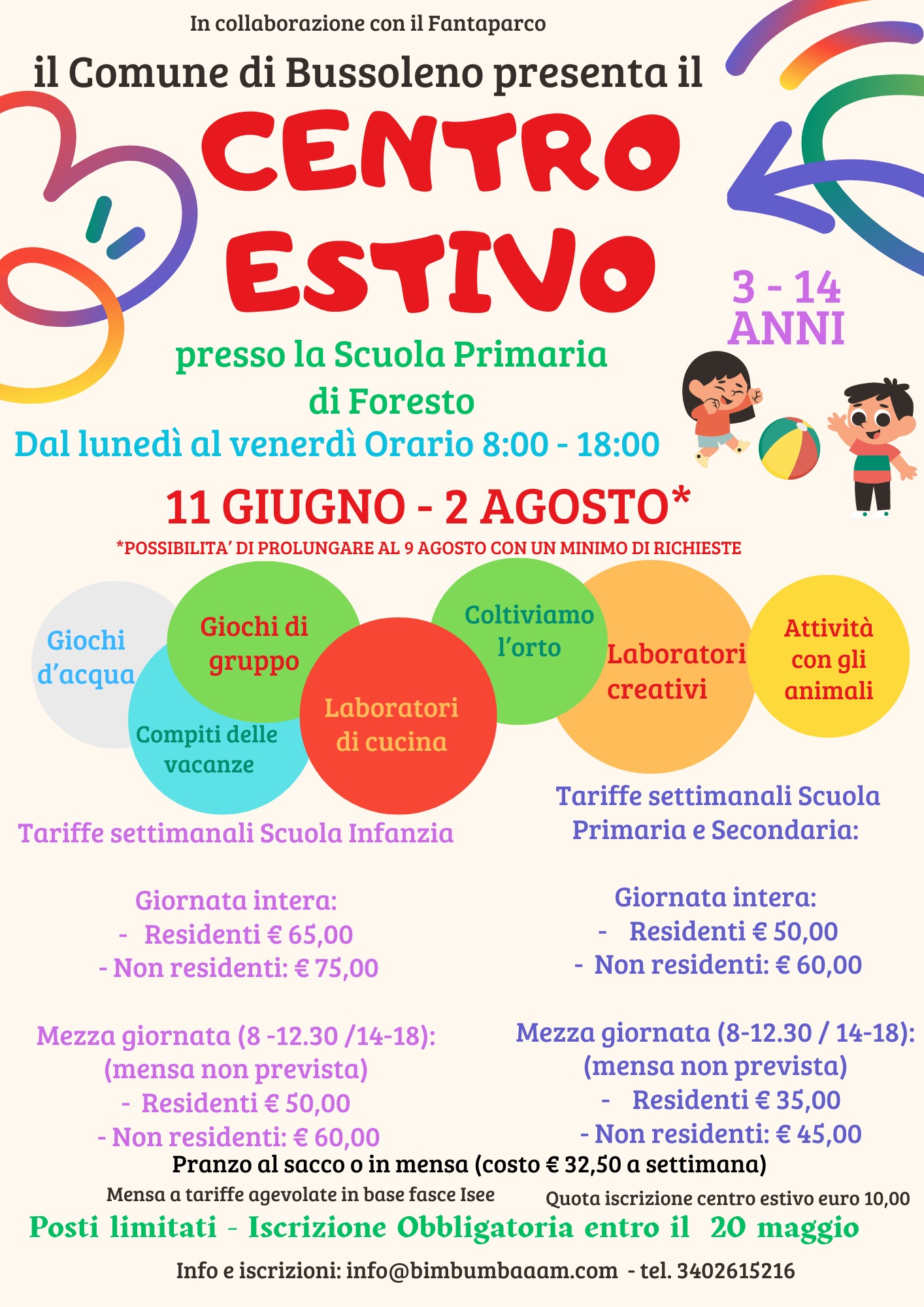 L'Amministrazione Comunale organizza anche quest'anno il Centro estivo a Foresto, con la collaborazione dell'Associazione Fantaparco, per bambini da 3 a 14 anni, dal 11 giugno al 2 agosto con possibilità di proroga.