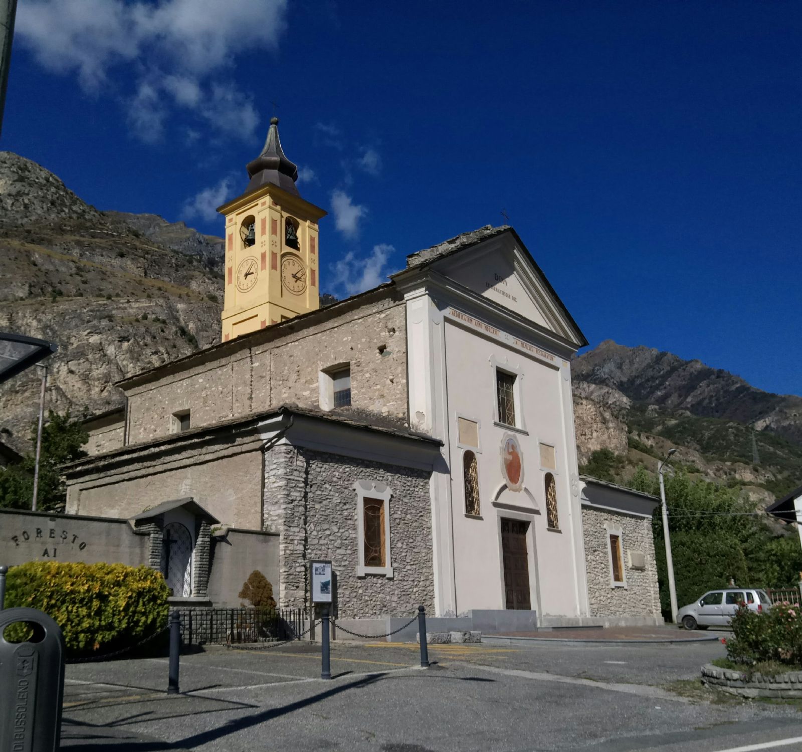 L'attuale chiesa parrocchiale di Foresto fu costruita nel 1721 in sostituzione di quella antica, danneggiata dalle alluvioni del Rio Rocciamelone, tra il 1864 e il 1894 venne ampliata con la costruzione delle navate laterali. La facciata della chiesa ha un semplice profilo a capanna coronato da un timpano triangolare ed è caratterizzata dalla presenza di un portale ligneo, delimitato da una cornice lapidea sovrastata da un timpano curvilineo spezzato. Nella facciata sono inoltre presenti due nicchie sovrastate da due meridiane.