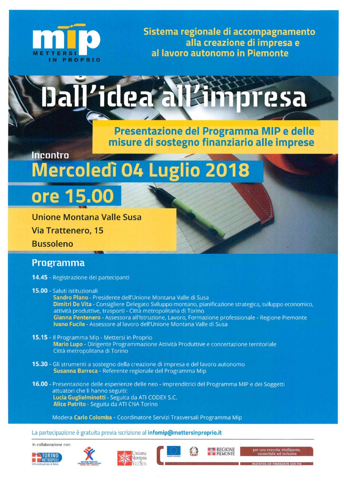 Presso la sede dell'Unione Montana Valle Susa in Bussoleno - via Trattenero 15 - sarà presentato il Programma MIP (Mettersi In Proprio) e le misure di sostegno finanziario alle imprese.
