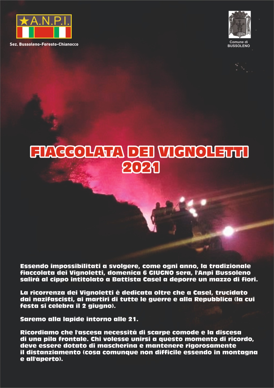 La celebrazione sarà effettuata domenica 6 giugno. Essendo impossibilitati a svolgere, come ogni anno, la tradizionale fiaccolata dei Vignoletti, l'Anpi Bussoleno salirà al cippo intitolato al partigiano ucciso Battista Casel da parte di due repubblichini per deporre un mazzo di fiori con il rientro alla lapide della Piazza di Foresto intorno alle 21.