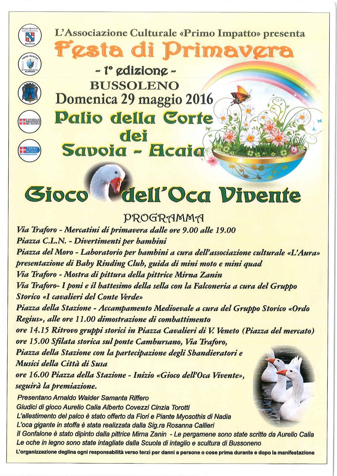 manifestazione organizzata dall'Ass.ne culturale PRIMO IMPATTO, con laboratori e giochi per bambini, sfilata di Gruppi storici per il Palio della Corte dei conti Savoia-Acaja e grande Gioco dell'Oca Vivente