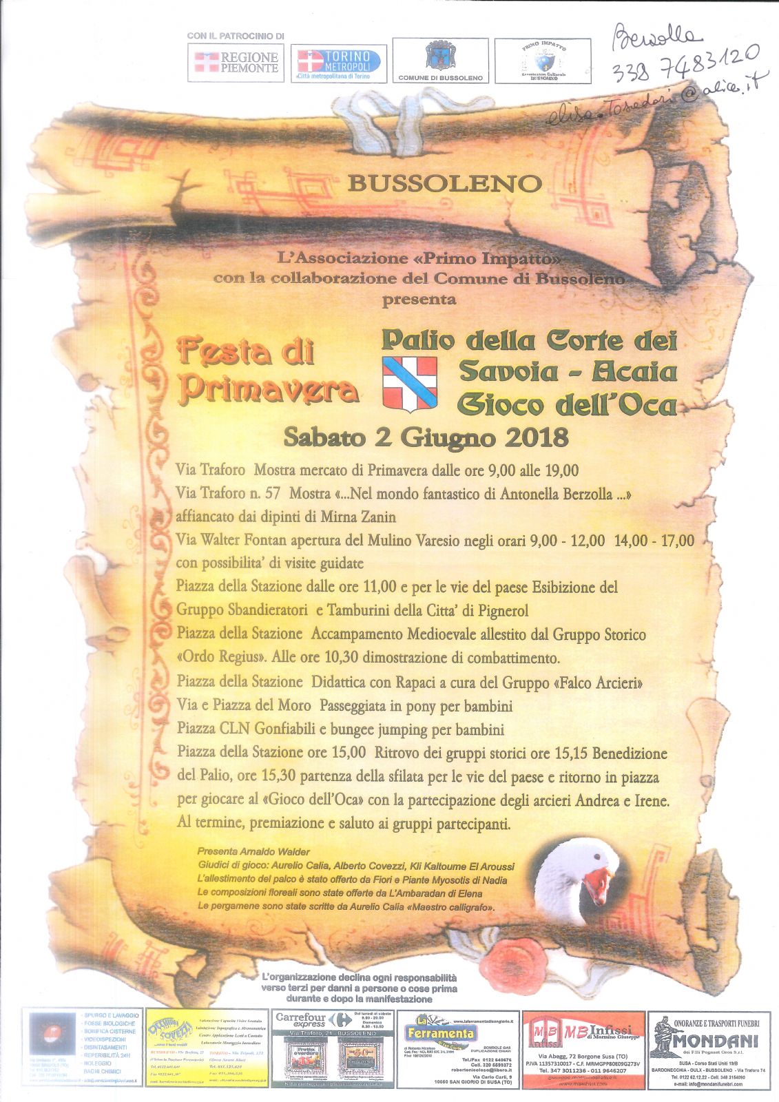 La Mostra-mercato organizzata dall'ass.ne "Primo Impatto" ha in programma fin dal mattino in piazza Caduti della Libertà (Stazione FFS) l’allestimento di un accampamento medioevale del gruppo storico “Ordo Regius” con dimostrazione di combattimento e una stazione didattica di rapaci a cura del gruppo Falco Arcieri; nel pomeriggio avrà luogo il ritrovo di gruppi storici per la sfilata del Palio e il Gioco dell'Oca; durante tutta la giornata saranno visitabili il Mulino Varesio (con apertura e visite guidate ad orari prestabiliti: 9.00; 12.00; 14.00; 17.00) e mostre di dipinti, nella Piazza del Moro sarà organizzata una passeggiata in pony e nella piazza CLN saranno disposti gonfiabili e bungee-jumping per bambini.