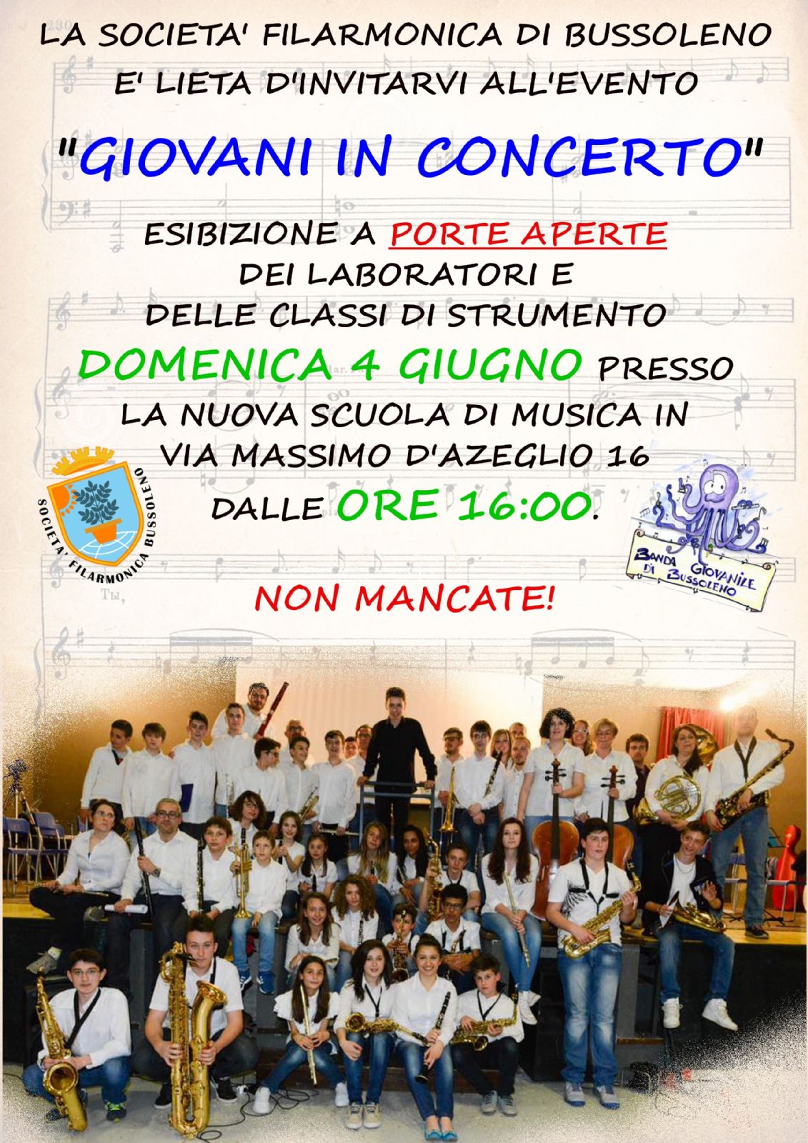 La Società Filarmonica di Bussoleno invita all'evento "Giovani in concerto" che si terrà DOMENICA 4 GIUGNO dalle ore 16:00 presso la nuova sede di Via Massimo D’Azeglio 16
