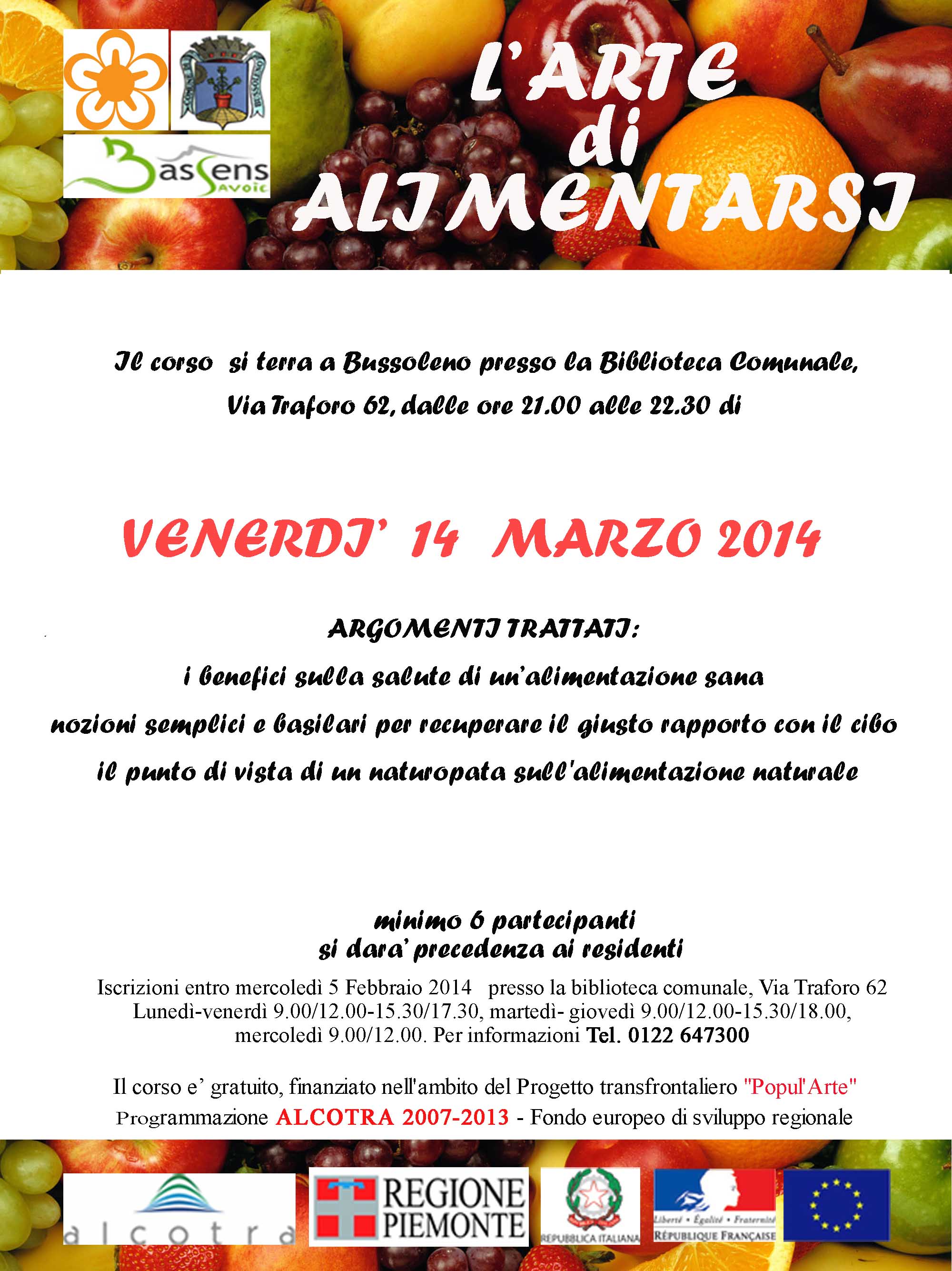 venerdì 14 marzo alle ore 21,00, si terrà il corso gratuito "L'arte di alimentarsi" presso la Biblioteca Comunale nell'ambito del progetto transfrontaliero "Popul'Arte"
