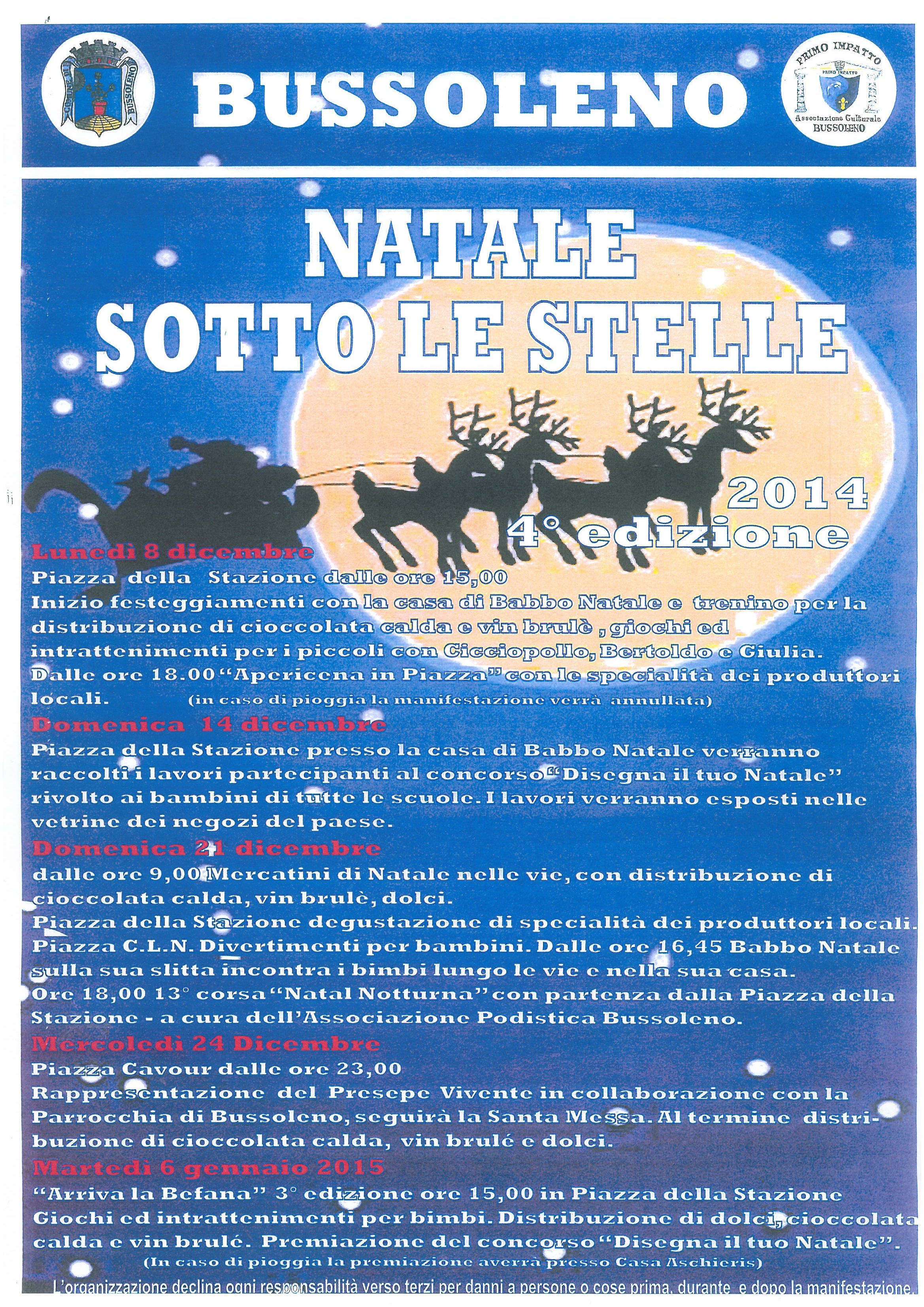 L'Associazione Primo Impatto organizza la 4^ edizione di NATALE SOTTO LE STELLE, nelle piazze e nelle vie di Bussoleno. Si inizia lunedì 8 dicembre 2014 dalle ore 15.00 in piazza della Stazione: una visita alla Casa di Babbo Natale, la presenza del Trenino e poi distribuzione di Cioccolata calda -per i più piccini- e Vin Brulé per chi gradisce. Alle ore 18.00 Apericena In Piazza con le specialità dei produttori locali ! Iniziative golose e divertenti sono previste anche per domenica 14 e domenica 21 dicembre. Mercoledì 24 alle ore 23.00 sarà presentato il Presepe Vivente in piazza Cavour . E... martedì 6 gennaio 2015 alle ore 15.00... "Arriva la Befana" in Piazza della Stazione!