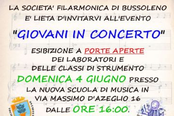 La Società Filarmonica di Bussoleno invita all'evento "Giovani in concerto" che si terrà DOMENICA 4 GIUGNO dalle ore 16:00 presso la nuova sede di Via Massimo D’Azeglio 16