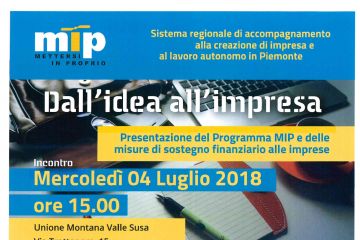 Presso la sede dell'Unione Montana Valle Susa in Bussoleno - via Trattenero 15 - sarà presentato il Programma MIP (Mettersi In Proprio) e le misure di sostegno finanziario alle imprese.