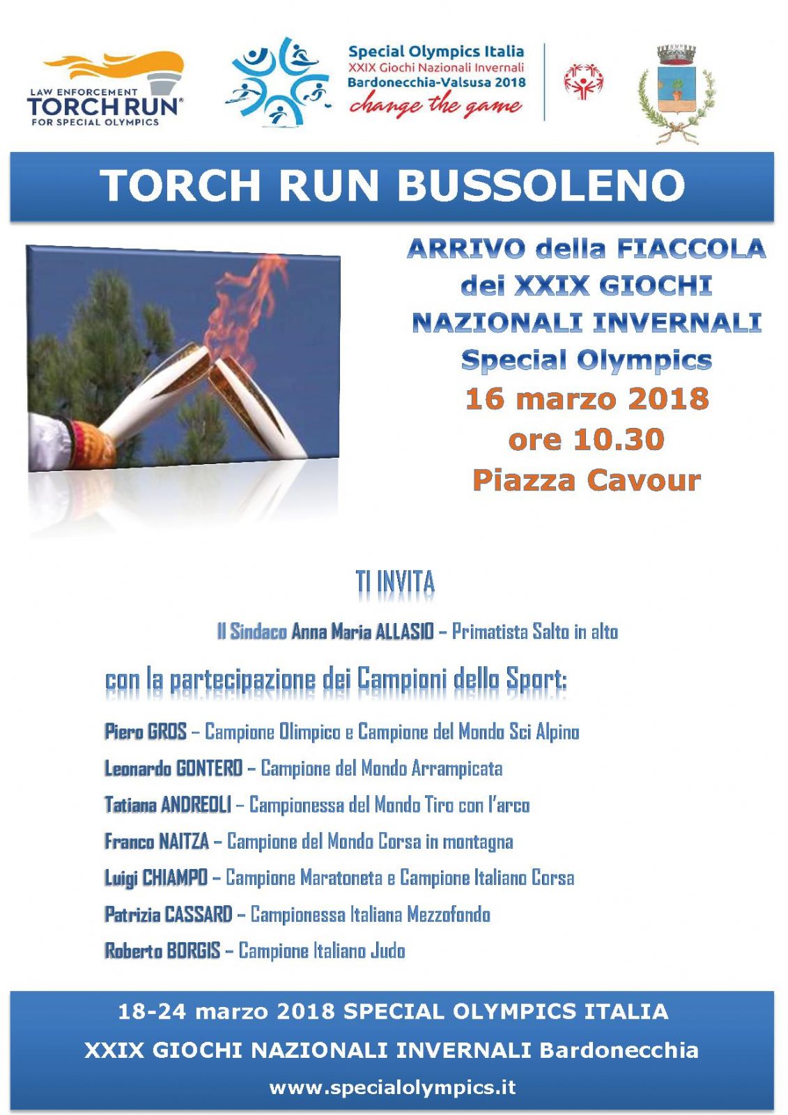 In occasione dei XXIX Giochi nazionali Invernali Special Olympics che si svolgeranno dal 18 al 24 marzo a Bardonecchia, il 16 marzo alle ore 10.30 arriverà a Bussoleno la Fiaccola della Speranza, lungo le vie del centro storico del paese con arrivo in Piazza Cavour. Ad accoglierla ci saranno le Autorità locali e numerosi campioni dello sport di ogni tempo, oltre a studenti, associazioni e cittadinanza (per maggiori dettagli vedere la locandina allegata).