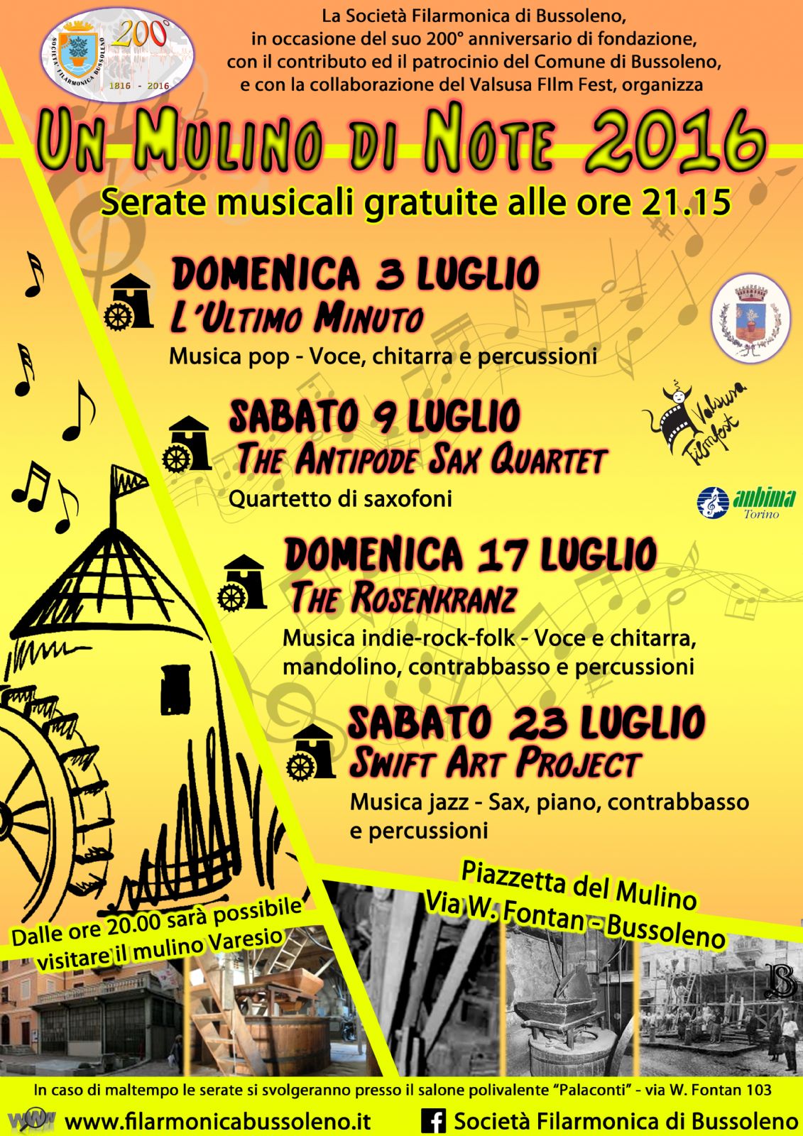 L'Amministrazione comunale e la Società Filarmonica di Bussoleno sono liete di invitarvi all’edizione 2016 del Mulino di Note!! Quattro serate gratuite di musica a partire dalle ore 21.15, nella caratteristica location della Piazzetta del Mulino in via Walter Fontan a Bussoleno.
